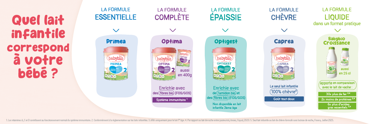 Pour vous simplifier la tâche dans votre choix, toutes les formules Babybio, quelle que soit la gamme et quel que soit l’âge, contiennent désormais :